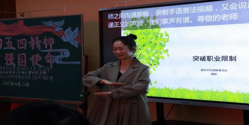 特殊教育(信息与资源)专业2013级两位优秀校友石柱县特殊教育教师周梦婷和重庆华代律师事务所执业律师谭婷为大家分享。译心手语翻译团队现场提供手语翻译服务。