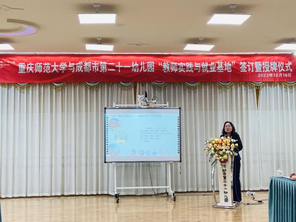 园长杨敏向大家介绍了二十一幼的办园理念、发展历史、特色课程等,同时还介绍了成都市武侯区学前教育发展情况和相关教育政策。