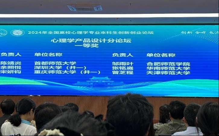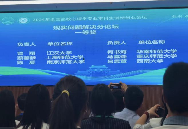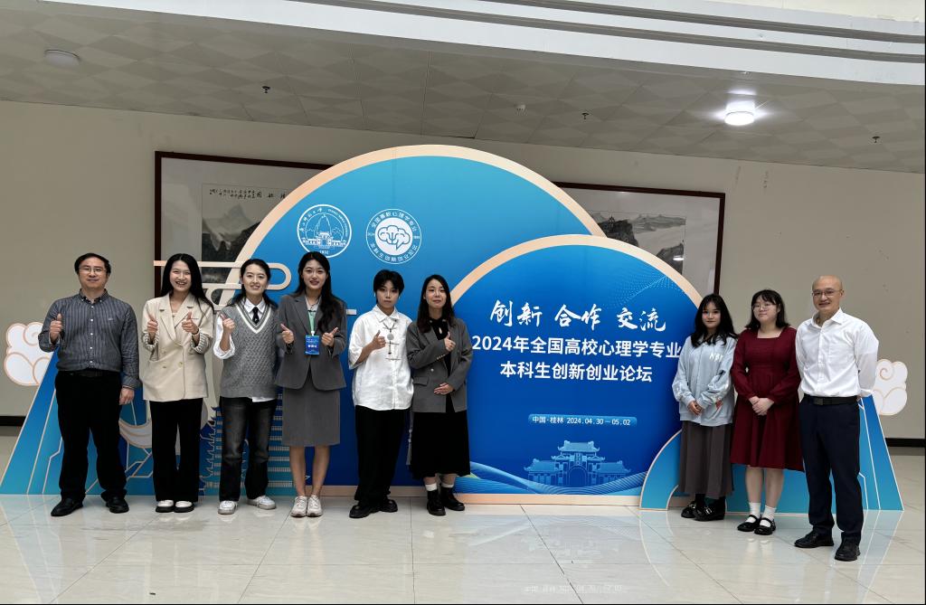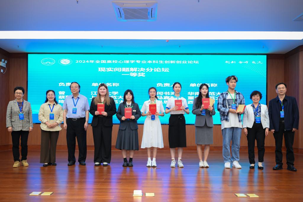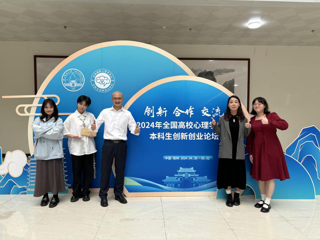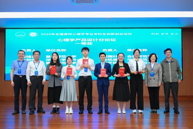 2024年5月2日,由教育部高等学校心理学类专业教学指导委员会主办,广西师范大学及心理学拔尖学生培养模式改革虚拟教研室共同承办的“2024年全国高校心理学专业本科生创新创业论坛”圆满落幕。在论坛初评阶段,来自全国160个单位的444件作品参与评选,包括心理学实验设计73件、现实问题解决122件、产品设计109件、科普视频140件,均由59位专家组成的团队进行评审。我校共有2件作品进入现场展示环节,在激烈的竞争中脱颖而出荣获一等奖,成为全国160所参赛高校中仅有的三所获得两项一等奖的单位之一。