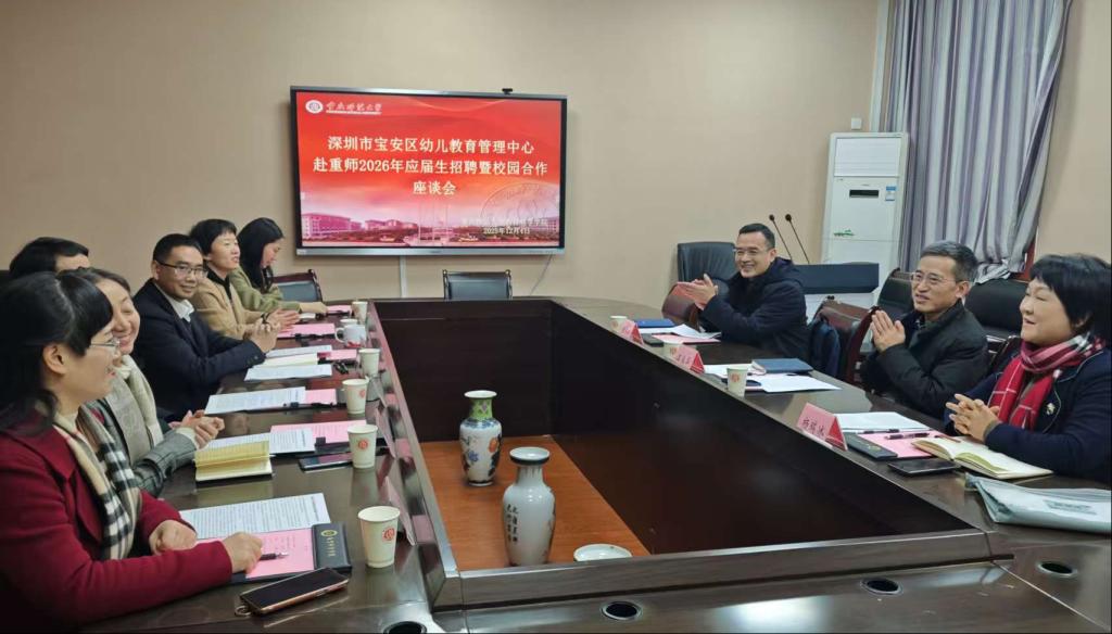 于砺志楼2434会议室,共同举行2026届毕业生招聘及校园合作座谈会。宝安区教育局四级调研员温福华、幼儿教育管理中心主任李新华一行,与avcar