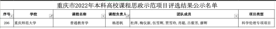 根据《重庆市教育委员会关于开展 2022 年课程思政示范项目申报工作的通知》要求,经教师申请、学院推荐、教务处资格审查、学校专家评审、学校申报、高教处专家评议,杨思帆教授的《普通教育学》获重庆市2022 年本科高校课程思政示范项目认定。