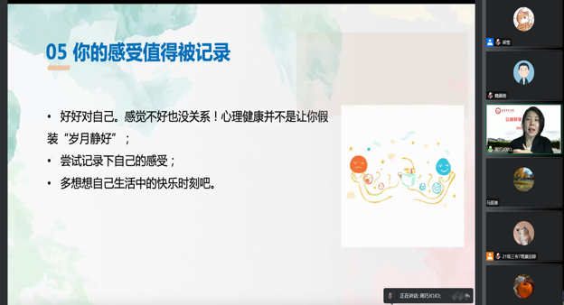 周老师就什么是情绪,情绪与压力的关系两方面向大家进行阐述,她以情绪自评量表为切入点,围绕疫情期间容易产生的情绪问题进行了详细讲解。周老师告诉同学们这些情绪的产生都是疫情大背景下的正常表现,并提供了相应的情绪调适方案。此外,周老师还引导同学们要“勤于自助”、“乐于互助”、“善于求助”,尝试采用各种有益的方式调节自我情绪和心理压力,进而发挥心理觉察的智慧,提升情绪自控力,保持乐观积极健康的心态。