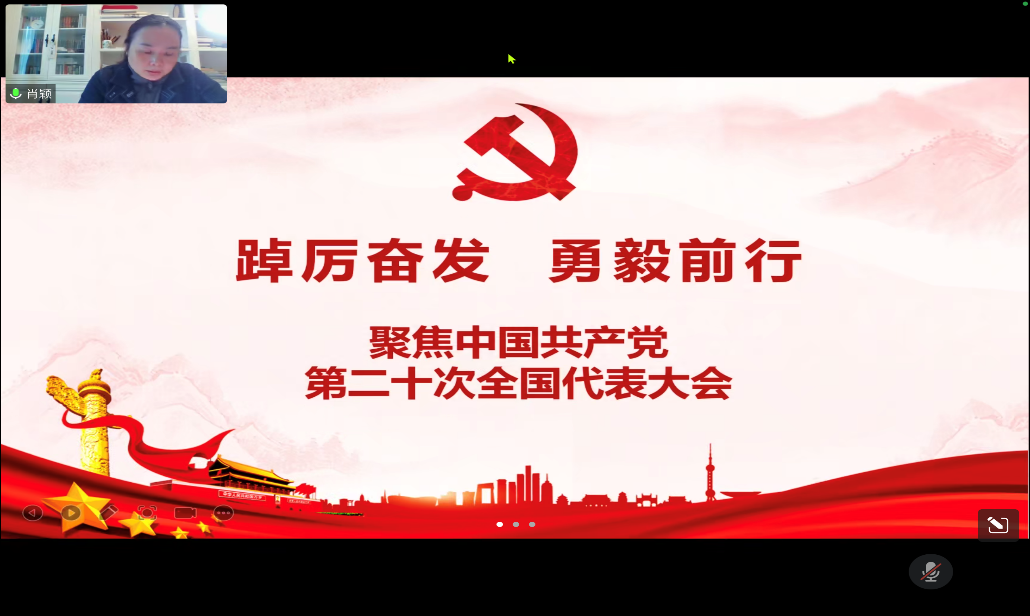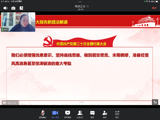 为了进一步加强党支部建设,学习党的先进思想,提升党员理论修养,肖颖带领支部成员学习“党的二十大新提法”并进行解读。习近平总书记对青年寄语:“青年强,则国家强。当代中国青年生逢其时,施展才干的舞台无比广阔,实现梦想的前景无比光明。”在中华民族伟大复兴的新征程上,虽然每个年轻人所处的地域、家庭环境不同,但都有无穷的潜力和机会。青年应当树立远大的理想和抱负,将实现个人价值的目标与时代奋进的目标结合起来,在不懈奋斗中实现人生价值。