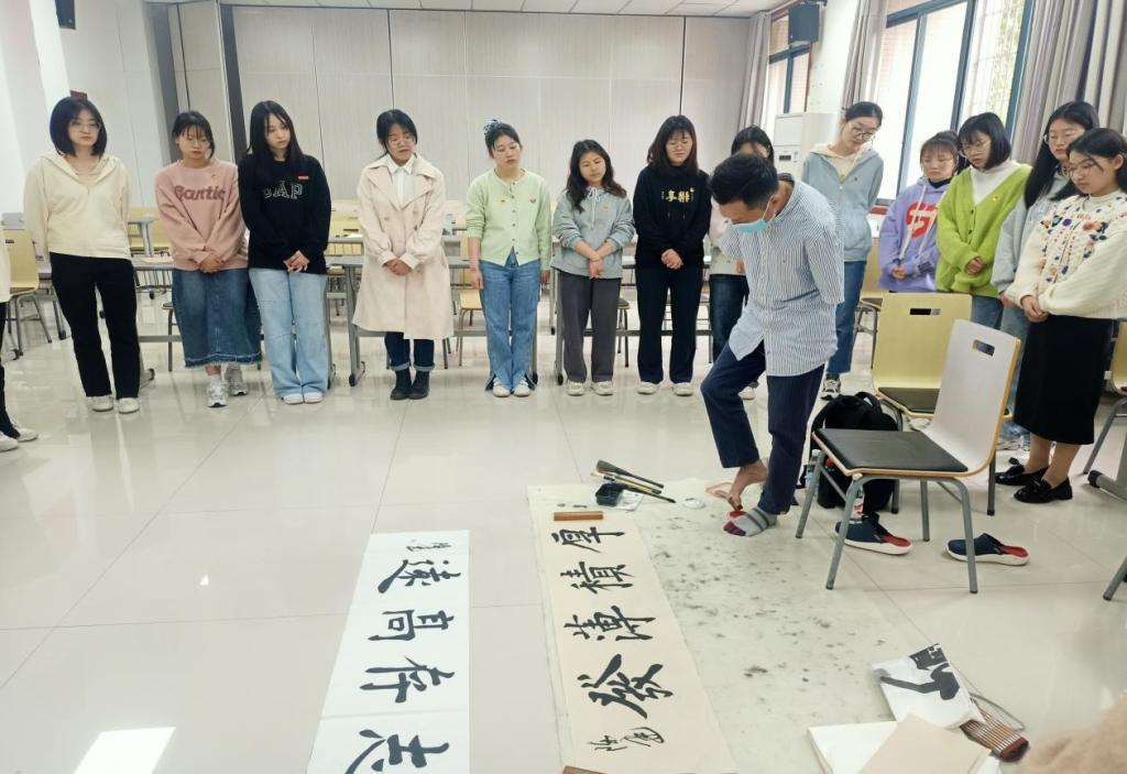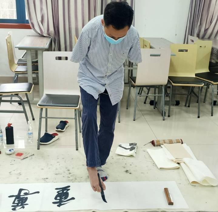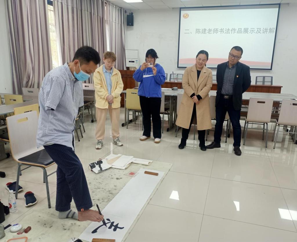 活动开始,支部书记肖颖同志向我们详细介绍了残疾人书法家陈建老师。陈建老师5岁时因双手触碰到高压电截去双臂,一度连走路都无法维持平衡,没有学校收留他,但陈建老师在逆境中坚韧不拔,锐意进取,从未停下前进的脚步。12岁起学习用脚和口叼的方式写字,由于没有接受过系统的教育,只能慢慢摸索,在日复一日的练习中,他精通了行、楷、隶、草四种字体的写法和技巧,能用脚写出一笔好字。