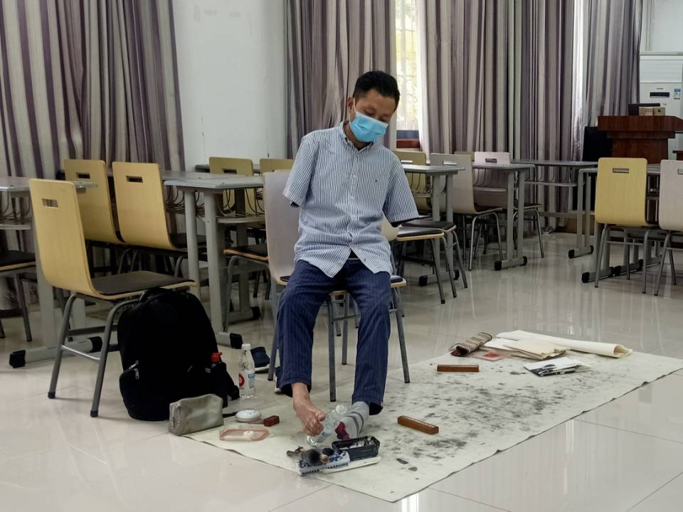 活动中,陈建老师为我们现场挥毫展示书法作品。无论是书写前的准备工作:铺毛毡、镇纸、蘸墨等,还是书写后加盖印章、拿起展示,陈建老师一气呵成,全程都不需要任何人帮助,他的楷书力透纸背,行书章法自如,草书龙飞凤舞,隶书质朴庄重,一撇一捺之中都包含着线条和墨色的魅力,一横一竖中都凸显着生命的伟大与坚韧。