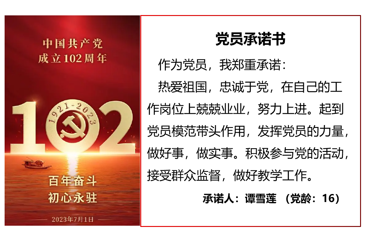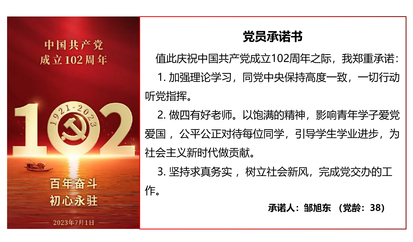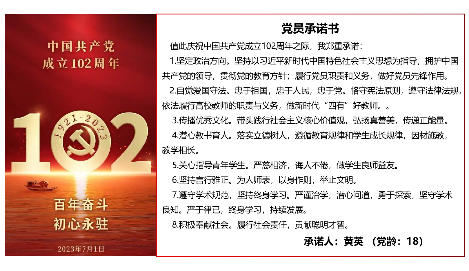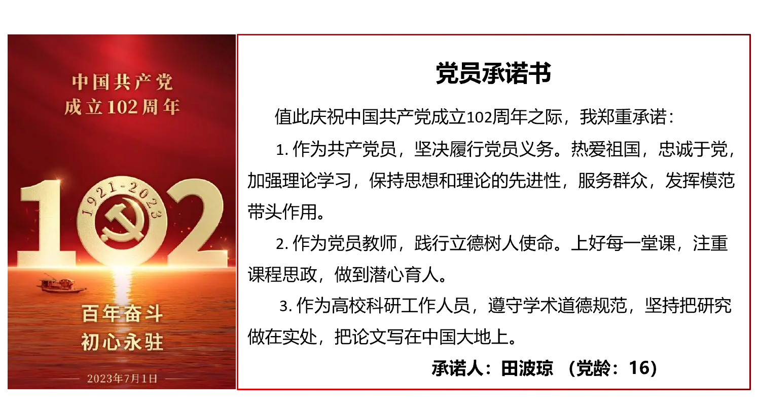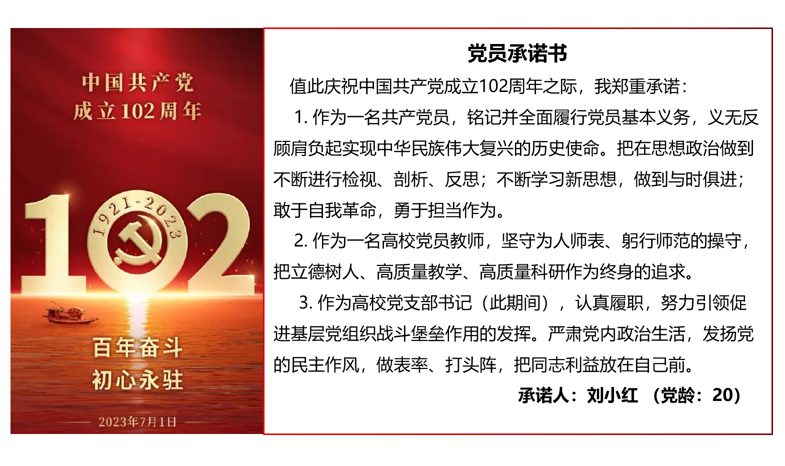 基于罗庆书记对课题“新时代党员承诺制的实践创新研究”所作阐释的理解,一支部17位党员教师在读党章、温誓词、学党史之后,郑重立下个人承诺。承诺书如下(按照党龄排序):