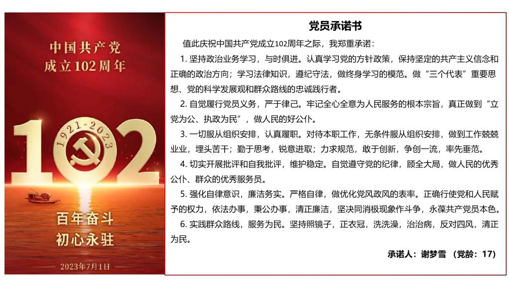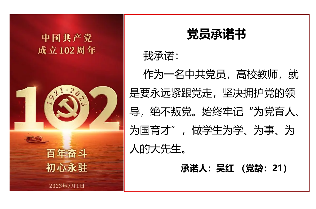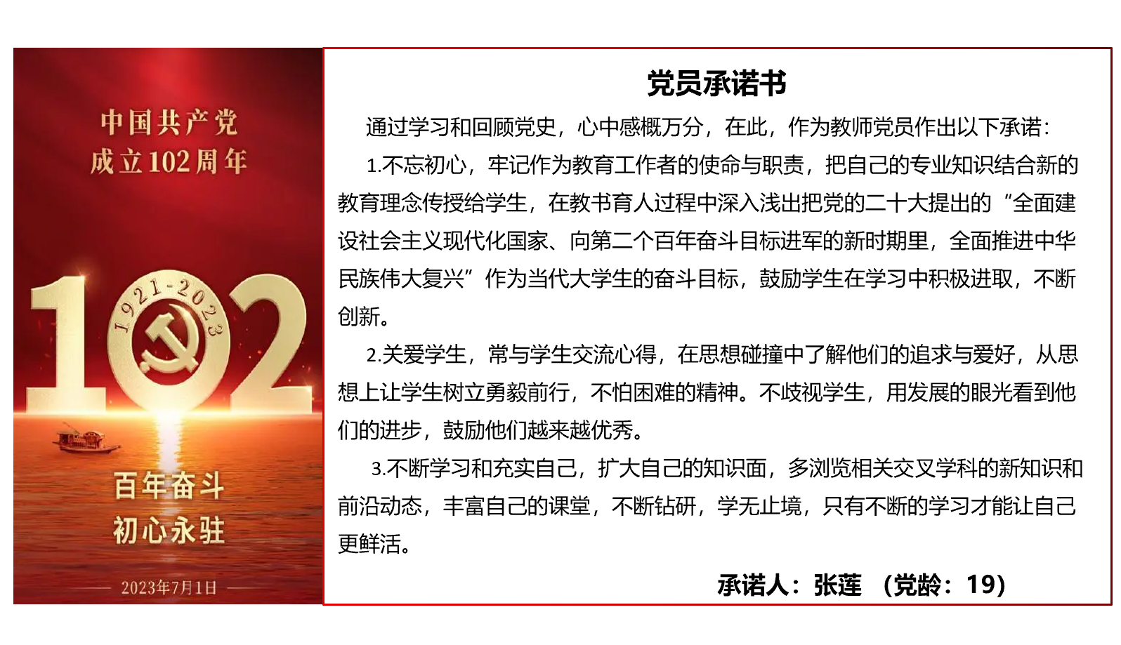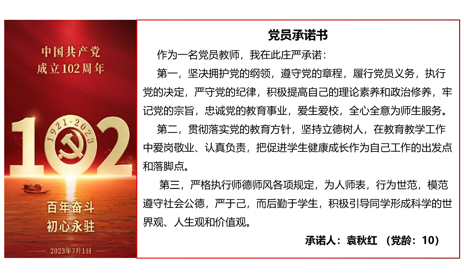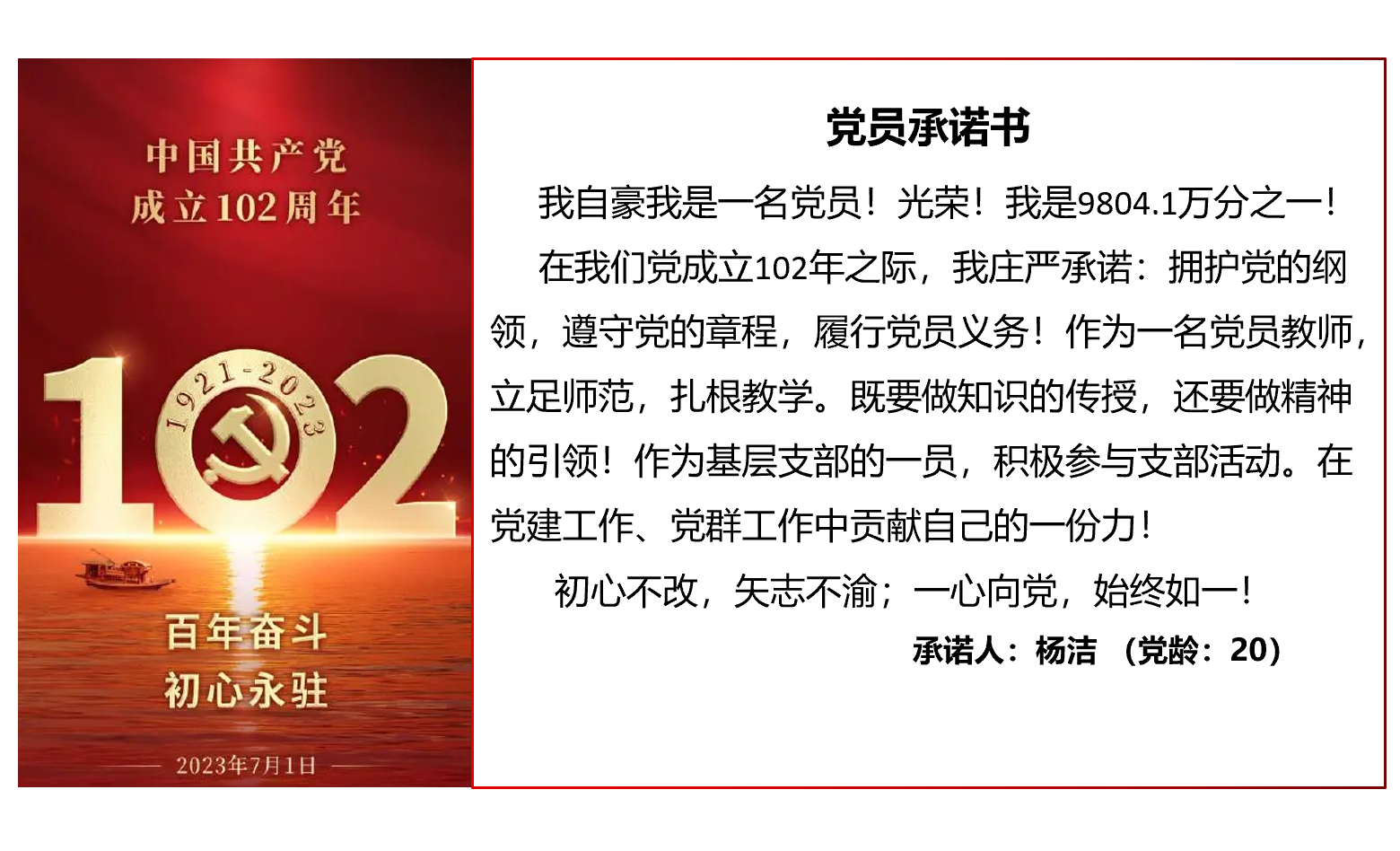 基于罗庆书记对课题“新时代党员承诺制的实践创新研究”所作阐释的理解,一支部17位党员教师在读党章、温誓词、学党史之后,郑重立下个人承诺。承诺书如下(按照党龄排序):