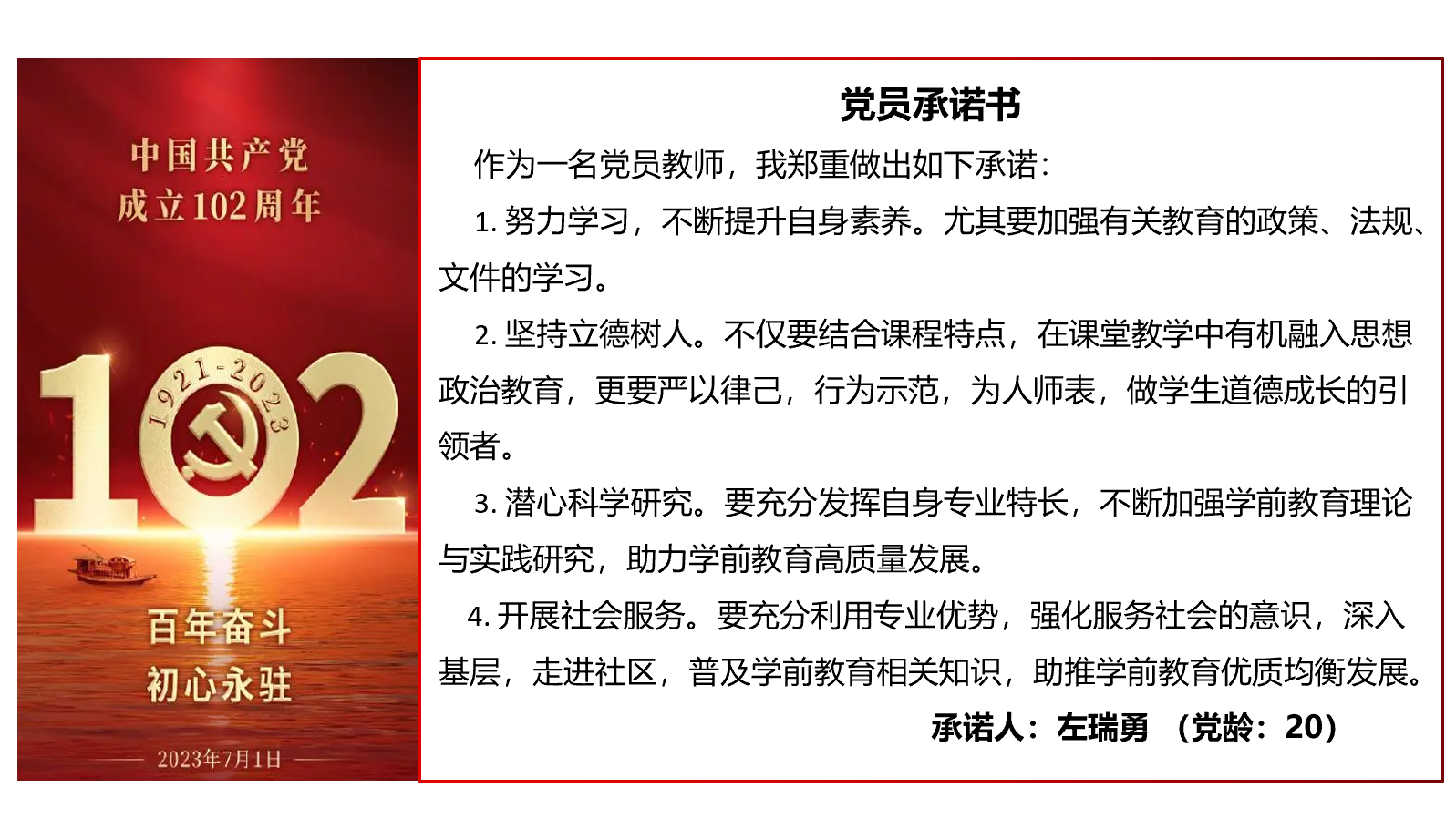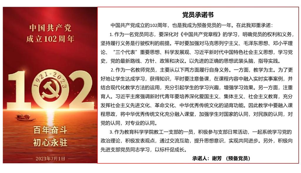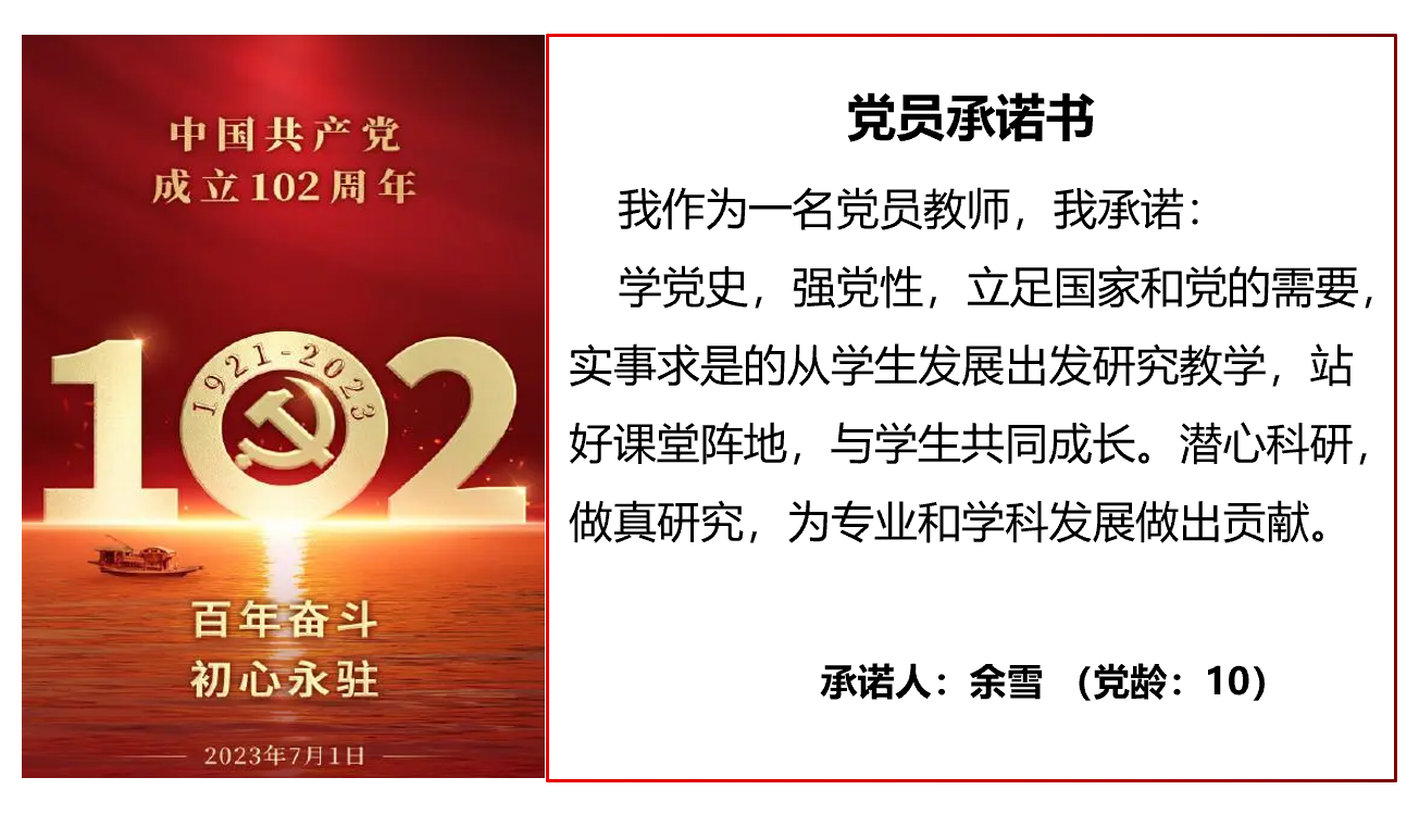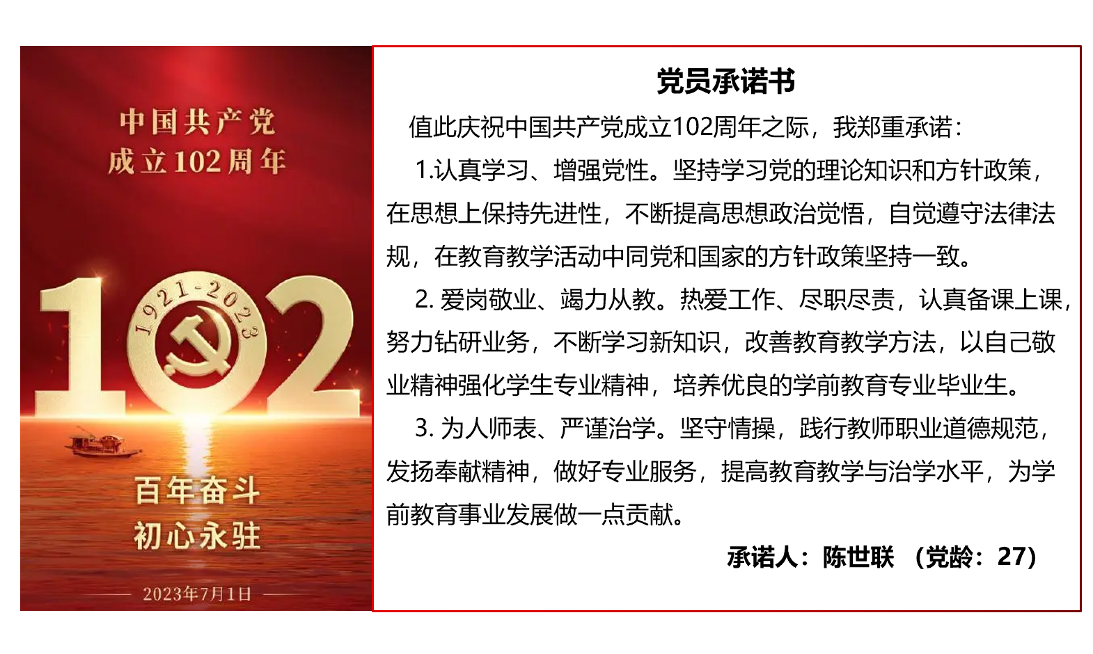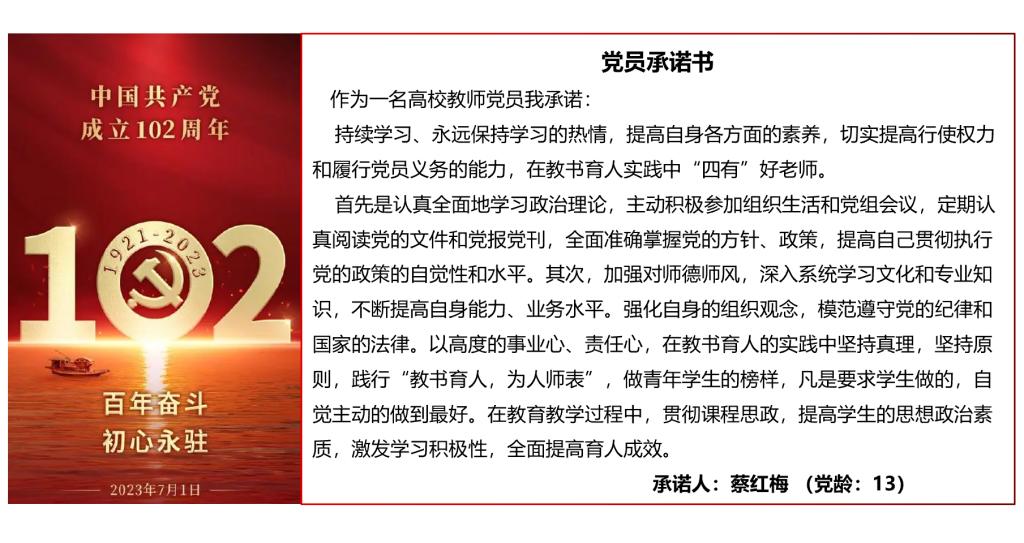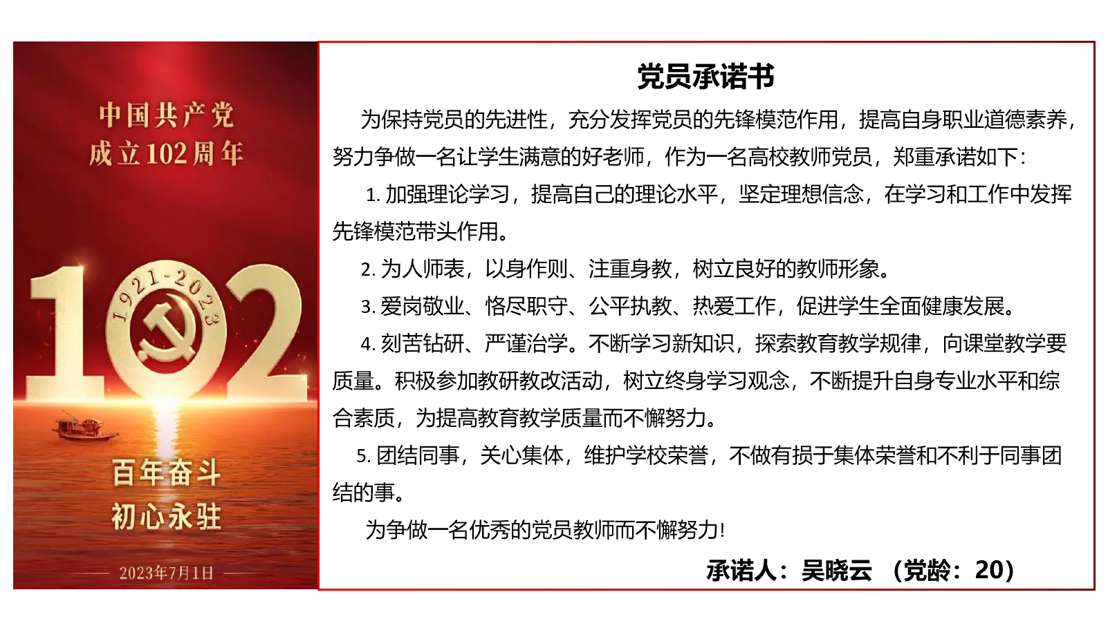基于罗庆书记对课题“新时代党员承诺制的实践创新研究”所作阐释的理解,一支部17位党员教师在读党章、温誓词、学党史之后,郑重立下个人承诺。承诺书如下(按照党龄排序):