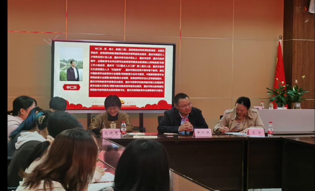 图为申仁洪老师为学生党员分享经验