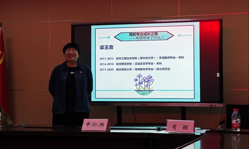 梁玉音老师从“我的成长之路” “我和伙伴做了什么” “前辈教诲,个人体验”三个方面,分享了自己的学习生涯和工作经历:首先,特殊教育工作者在获得残障人群带来的红利的同时,要保持初心,兢兢业业地工作,全心全意地服务,坚持并做好自己热爱并认定的事情;其次,特教人要有无私的精神,要广泛参加公益志愿活动,作为一个特教人,看着特殊孩子在特教工作者的教育和帮助下,一步一步实现自己人生价值,是一件很幸福的事,这也是特殊教育的意义所在;最后,梁老师衷心地祝愿全体学生党员能够在以后的学习时光中找到自己的人生价值,体验当下生命所流淌着的光芒。