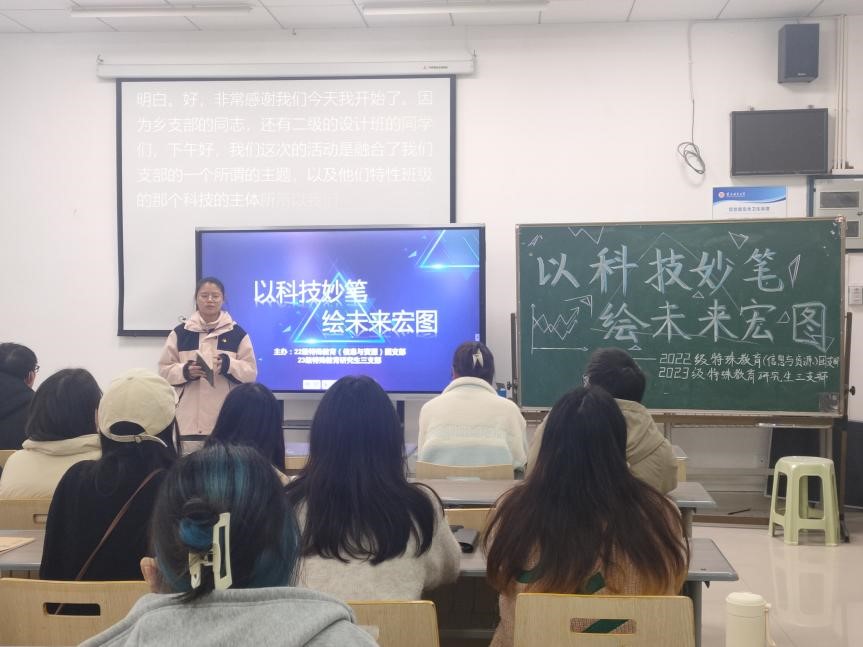 首先,由2022级特殊教育(信息与资源)本科团支部同学进行“中国科技发展历史及杰出人物”的分享,并通过视频、图片、人物事迹等方式回顾了新时代中国科技强国的发展历史。在璀璨的历史长河中,我们走进“钱学森”“冯如”“钱天白”等科技先辈的科研生活,学习他们在中国科技发展事业中做出的伟大贡献。研究生三支部负责人翁瑾同志对手语技术的发展及手语无障碍交流进行了介绍与分享,带领同学们观看了现代信息技术应用在手语无障碍设施上的相关视频,加深了同学们对于无障碍沟通环境建设的理解。