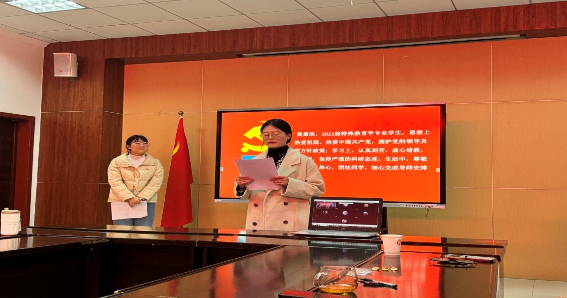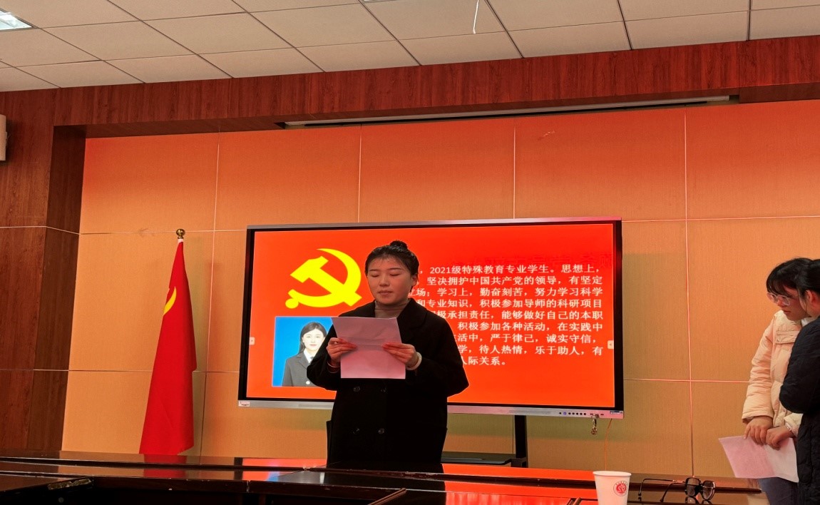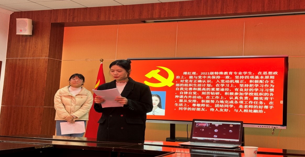 首先,主持人刘志英同志宣读《关于接收发展对象为中国共产党预备党员的决议》,宣读发展对象名单。其次,由三名发展对象,元振丽、傅红理、黄嘉欣宣读《入党志愿书》。